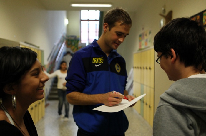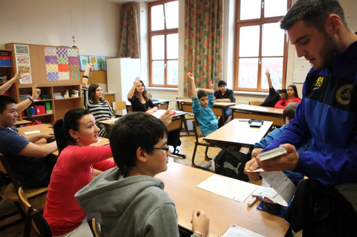 Vienna-Verteidiger Patrick Osoinik erzählte den Schülern über die entspannte Atmosphäre auf der Hohen Warte, die positive Stimmung, die vom blau-gelben Anhang ausgeht und lud alle Kinder ein, beim nächsten Heimspiel am Freitag um 18:30 Uhr gegen den WAC/St. Andrä dabei zu sein.