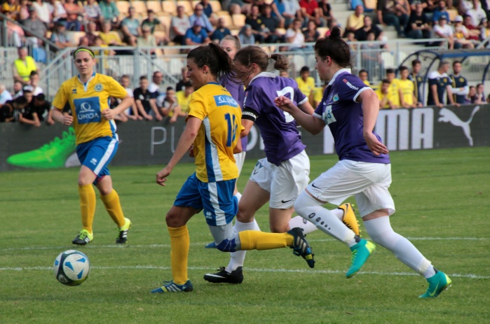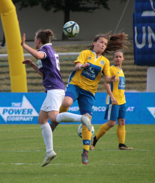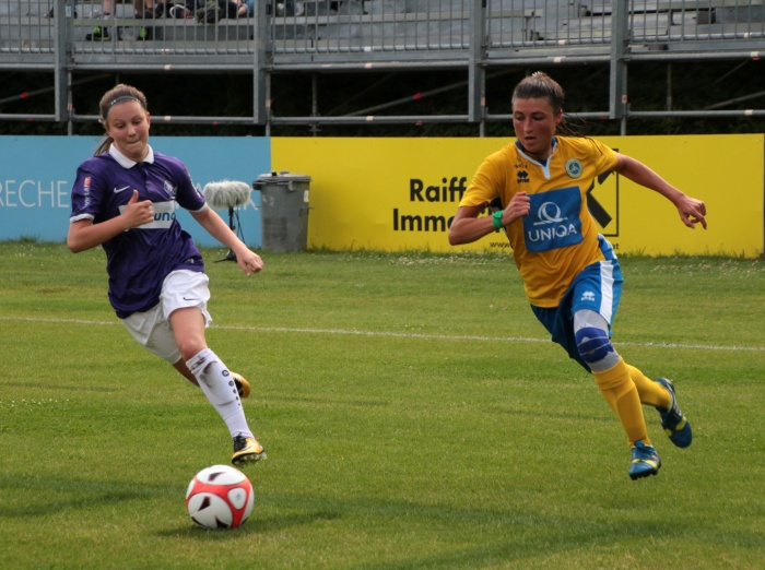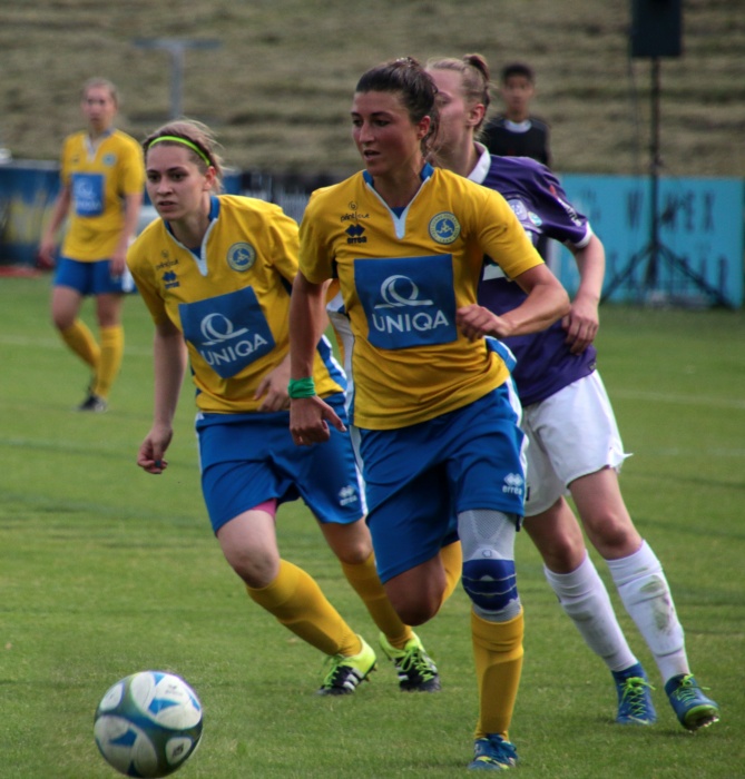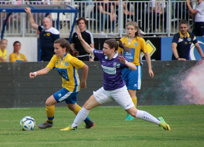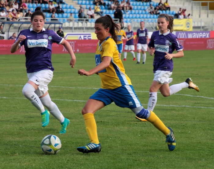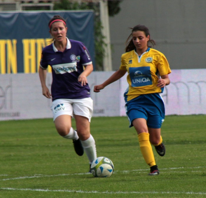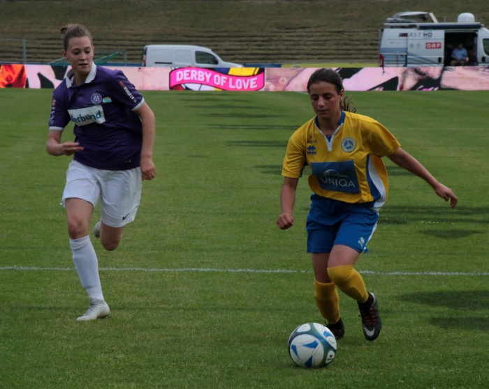 Bereits die nächste Aktion war sehenswert, ausgehend von Brunmair wurde der Angriff auf die rechte Seite verlagert, wo Mattner-Trembleau nur durch ein Foul zu stoppen war. Nun waren die Vienna Ladies endgültig im Spiel angekommen, im Mittelfeld stimmte die Raumaufteilung, man ließ die Austria nur mehr selten in Strafraumnähe kommen, andererseits wurde nach Ballgewinn zügig nach vorne gespielt. Vornehmlich liefen die Angriffe über die rechte Seite, mit der Schnelligkeit von Mattner-Trembleau kamen die Veilchen gar nicht zu recht.