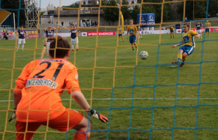 Kurz darauf vergab Liebhart die wohl beste Chance. Abermals war es ein flotter Vorstoß über rechts, Liebhart scheiterte alleine vor Hinterberger an der sich mutig in den Schuss werfenden Torfrau. Kurz vor der Pause kam auch die Austria wieder vor das Tor von Piplits, mehr als ein Eckball, den die Torfrau aber souverän abfing, kam dabei nicht heraus. Da Keles danach noch einen Freistoß in die Mauer schoss, ging es mit der knappen Führung in die Pause.