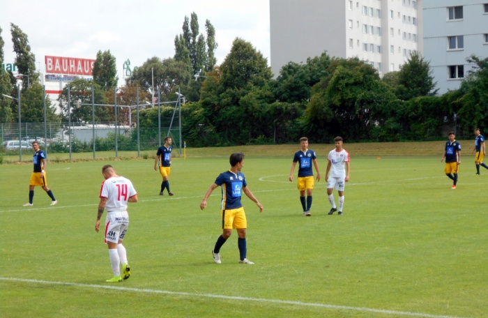 Offensiv sah man von der Vienna gute Ansätze, mit schnellem Überbrücken des Mittelfelds und lancieren der Außenspieler kam man des Öfteren gefährlich vor das gegnerische Tor. Ein erfolgreicher Abschluss wollte jedoch nicht gelingen, Van Zaanen verfehlte nach Zuspiel von Korkmaz knapp, Kurtisi traf nach Vorarbeit von Demic nur die Spitze des Lattenkreuzes, Demic selbst scheiterte am gegnerischen Keeper. Kontrolliertes Spiel wurde angesichts des sintflutartigen Regens in der ersten Halbzeit zusehends schwieriger, bis zur Pause fiel kein Tor mehr.