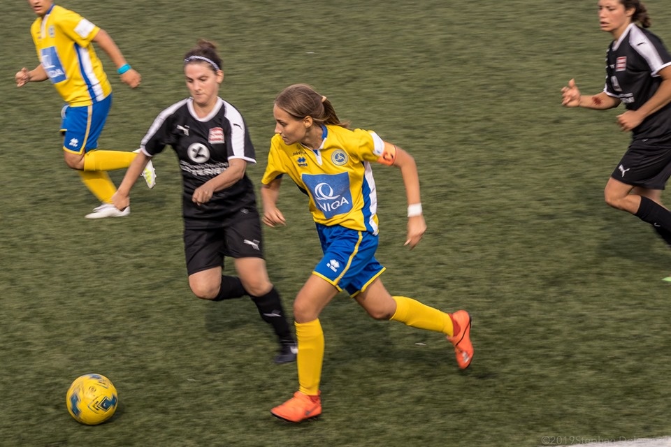 Nach dem Seitenwechsel sollte die gelb-rote Karte für Bobrowsky (62.) noch einmal Spannung ins Spiel bringen. Trotz des Treffers zum 4:0 durch Michelle Benkö (66.) riss in Folge der blau-gelbe Spielfaden und es schlichen sich einige vermeidbare Fehler im Spielaufbau ein. Die nun hektischer geführte Partie machte es den Akteuerinnen beider Mannschaften schwieriger den Ball über mehrere Stationen in ihren Reihen zu halten. In Folge dessen kamen beide Mannschaften noch zu der einen oder anderen aussichtsreichen, jedoch erfolglosen, Chance.