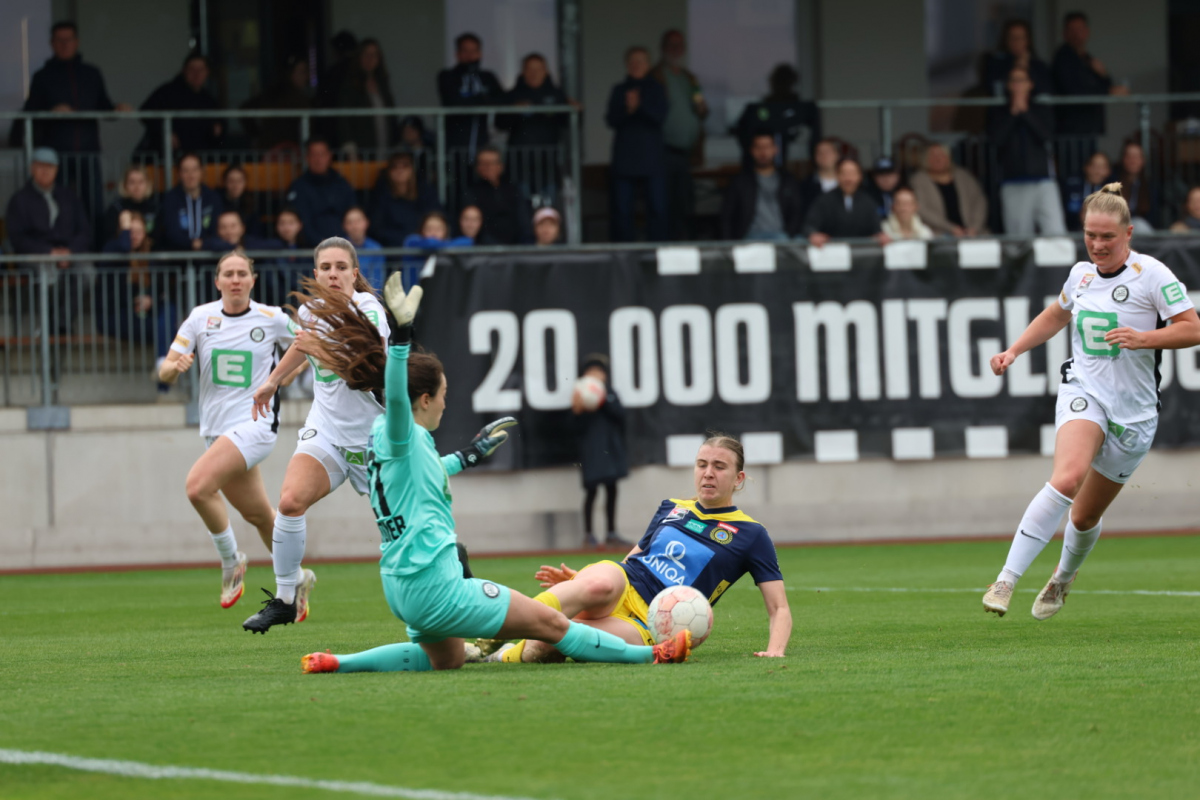 Auch die Gäste aus Wien fanden gut in die Partie und erspielten sich immer wieder vielversprechende Szenen im letzten Drittel. In der 13. Minute zeigte die Vienna eine sehenswerte Kombination: Gebert eroberte den Ball im Mittelfeld, spielte direkt weiter zu Höcherl, die mit einem Hackenpass traumhaft auf die durchstartende Gebert zurücklegte. Diese stand plötzlich frei vor der Sturm-Torfrau – anstatt selbst abzuschließen, wollte sie uneigennützig auf die mitgelaufene Wucher querlegen. Doch die Grazer Defensive roch den Braten und konnte die Vorlage im letzten Moment entschärfen.