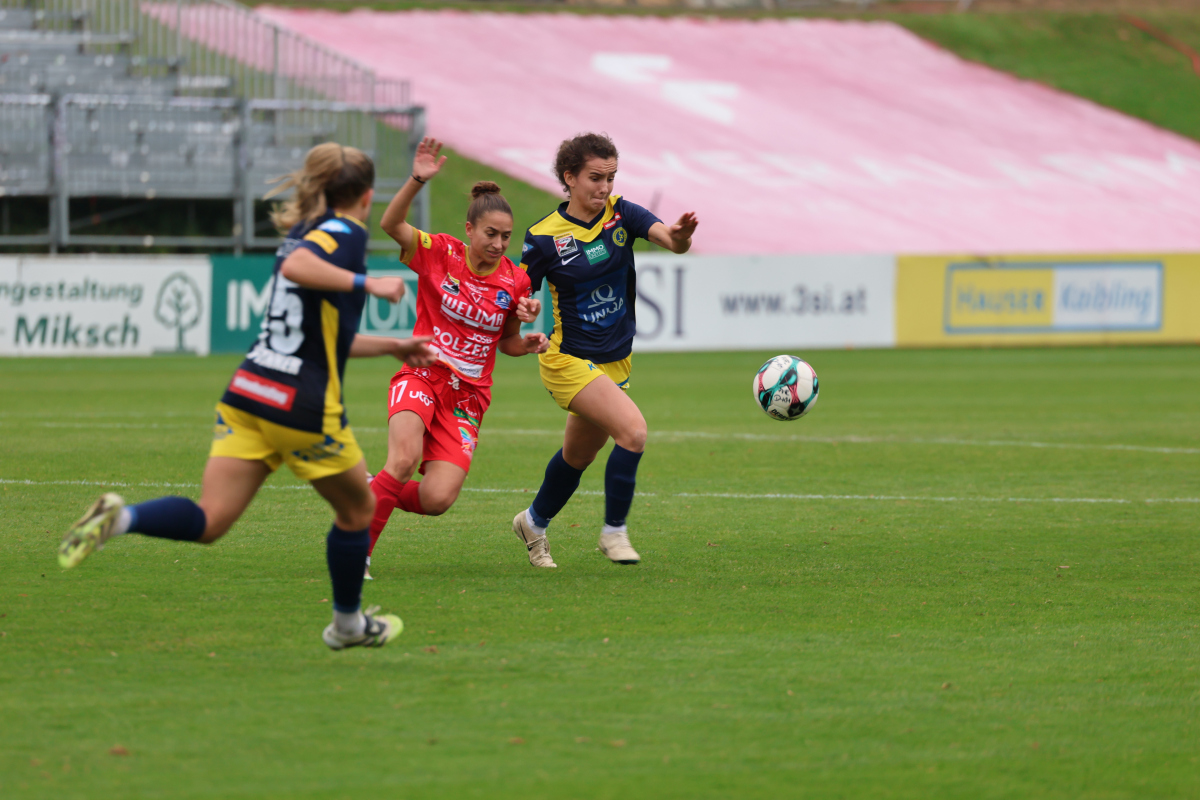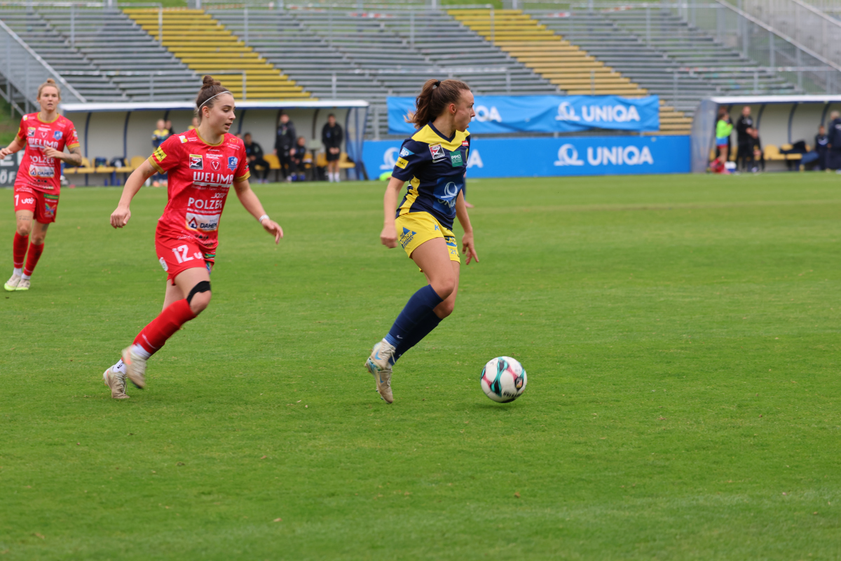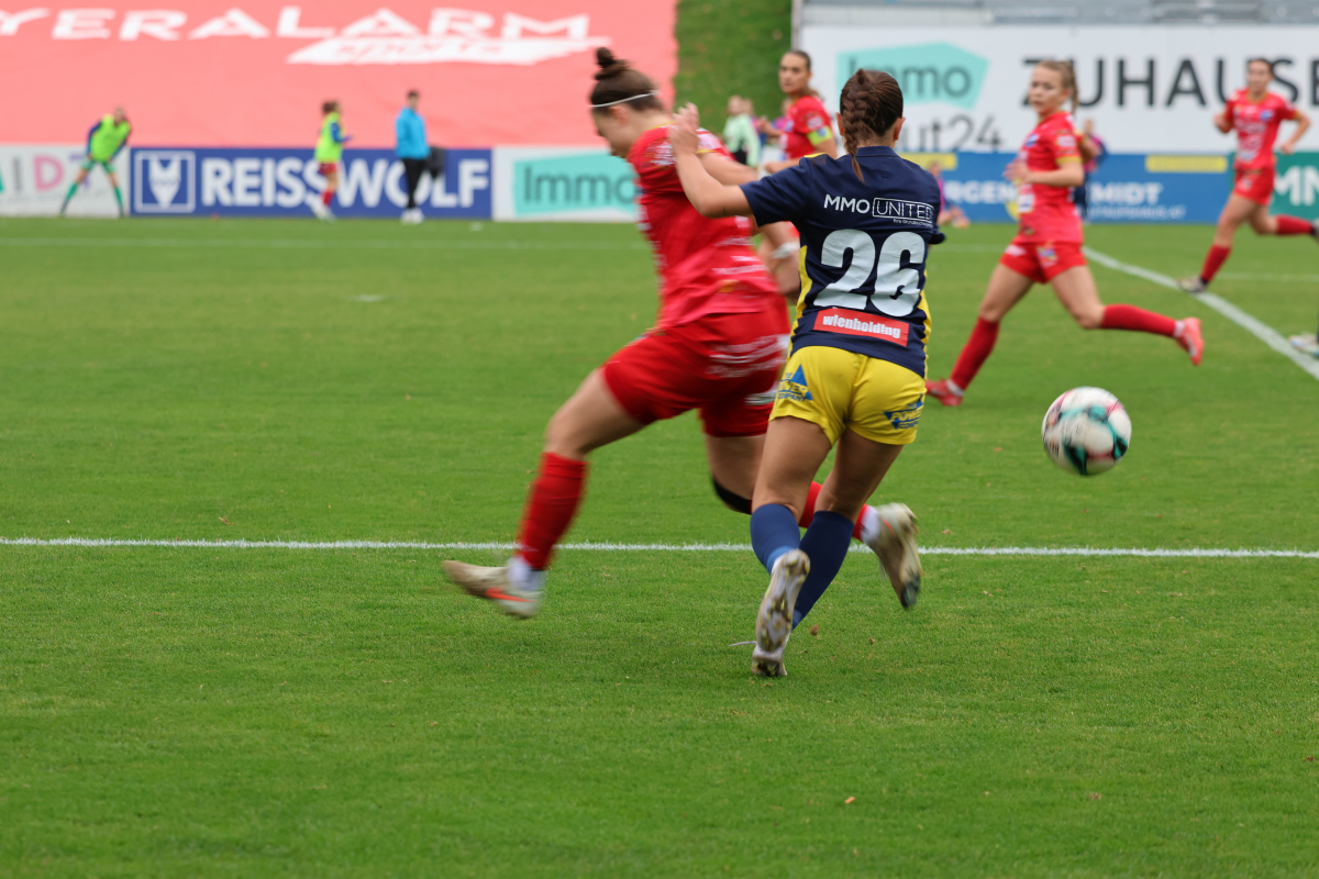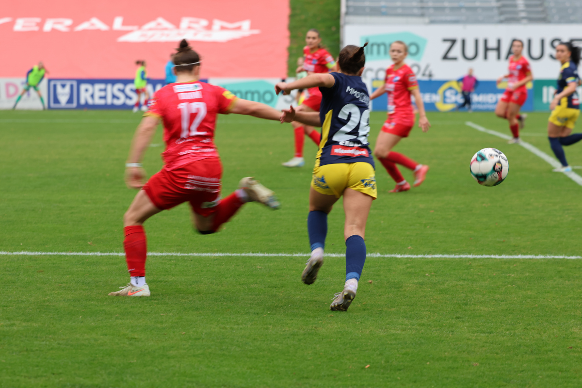 Die Gastgeberinnen ließen sich davon jedoch nicht beeindrucken und suchten weiterhin den Weg nach vorne. Amuchie hatte in der 33. Minute eine gute Gelegenheit, ihr Schuss aus der Distanz ging jedoch deutlich über das Tor. Kurz darauf setzte Hahn nach einem schönen Zuspiel von Höcherl einen gefährlichen Abschluss ab, den die Torfrau der Gäste mit einer starken Parade entschärfen konnte. Auch Schneiderbauer versuchte es wenig später aus der Ferne, verzog aber knapp.