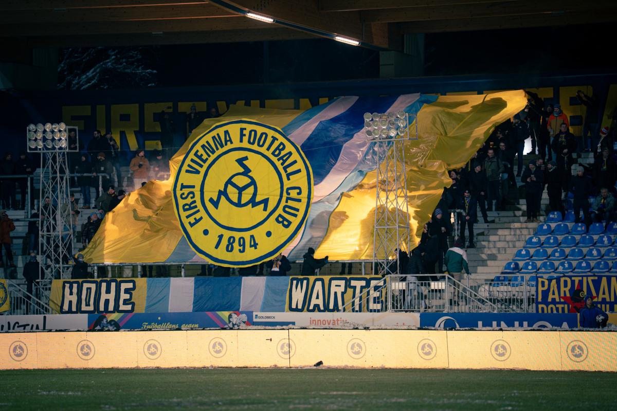 In dem Moment, als das Schiedsrichterteam und die Mannschaften den Rasen betraten, zeigten die Vienna-Fans ihre Liebe zum Verein und vor allem zur Hohen Warte mit einer atemberaubenden Choreo. Eine Blockfahne in den Vereinsfarben, dazu links und rechts in die Höhe ragende Flutlichtmasten und dazwischen das Logo unseres Herzensvereins „First Vienna FC“. Wer hier nicht Gänsehaut bekam, dem ist nicht mehr zu helfen.