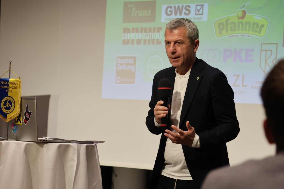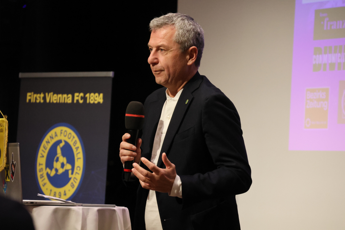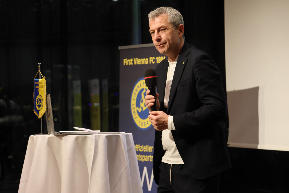 Wie gewohnt führte der Moderator und Vienna‑Stadionsprecher Erwin Gruber durch den Abend. Nach einleitenden Worten übergab er das Mikrofon an Vereinspräsident Kurt Svoboda, der die Geschehnisse der vergangenen Monate zusammenfasste und einen Einblick in verschiedene Teilbereiche der Vienna gab. Er hob hervor, was den Spirit rund um den Traditionsverein ausmacht, und bedankte sich bei den zahlreichen Unterstützerinnen und Unterstützern.