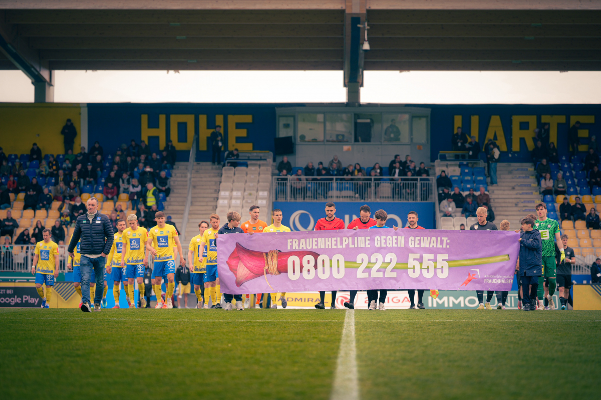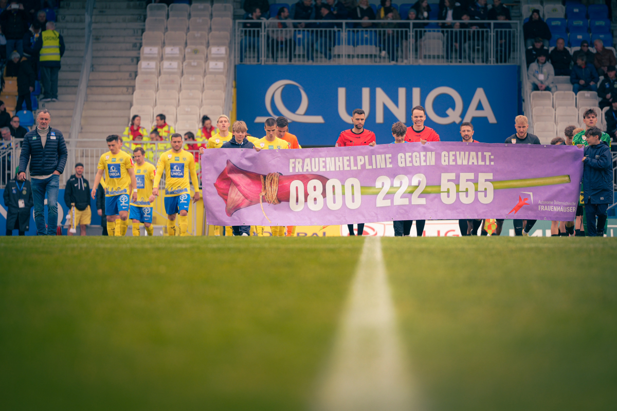 Bereits vor dem Anpfiff wurde auf eine wichtige Aktion aufmerksam gemacht: Unter dem Motto „Fanblock Bande“ begleiteten Nachwuchskinder beider Teams das Einlaufen mit einem Banner, das auf die Frauenhelpline sowie die Initiative hinwies. Im Rahmen dieser Aktion wird die Werbebande vor dem Fanblock den Autonomen Frauenhäusern Österreichs (AÖF) unentgeltlich zur Verfügung gestellt. Weitere Informationen findest du HIER.